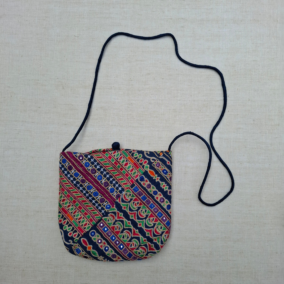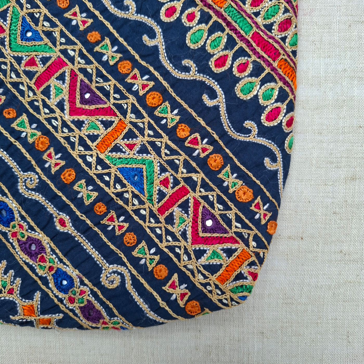 Crafted with care using traditional Ahir embroidery from Kutch, Gujarat, this evening bag showcases the region's rich textile heritage. Skilled artisans hand-embroider flowing, organic designs featuring elephants, flowers, peacocks, parrots, and scorpions—celebrating the local flora and fauna. Each pattern is drawn freehand and carefully transferred via stencil onto luxurious dupion silk. The multicolor embellishments create an elegant, statement piece perfect for special occasions. Measuring 8.5″ x 9″, it's a compact yet striking accessory. Dry clean only to preserve the intricate handiwork and vibrant colors.