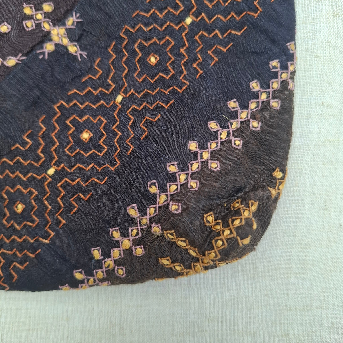 This beautiful hand-embroidered evening bag is done by the Haalepotra and Meghwaad Maarwaada communities, which practice eight styles of embroidery. They are best known for their Khudi-Tebha and Kambiro embroidery. The origin of these two styles can be traced to the traditional practice of recycling old garments, wherein the simple running stitch was used to join pieces of fabric that still had some life left in them. So neatly and uniformly did the women embroider the functional running stitch that over years and generations, it emerged as a decorative element with the potential to create elaborate motifs and designs. Measuring 7.5″ x 8″, it's a compact yet striking accessory. Dry clean only to preserve the intricate handiwork and vibrant colors.