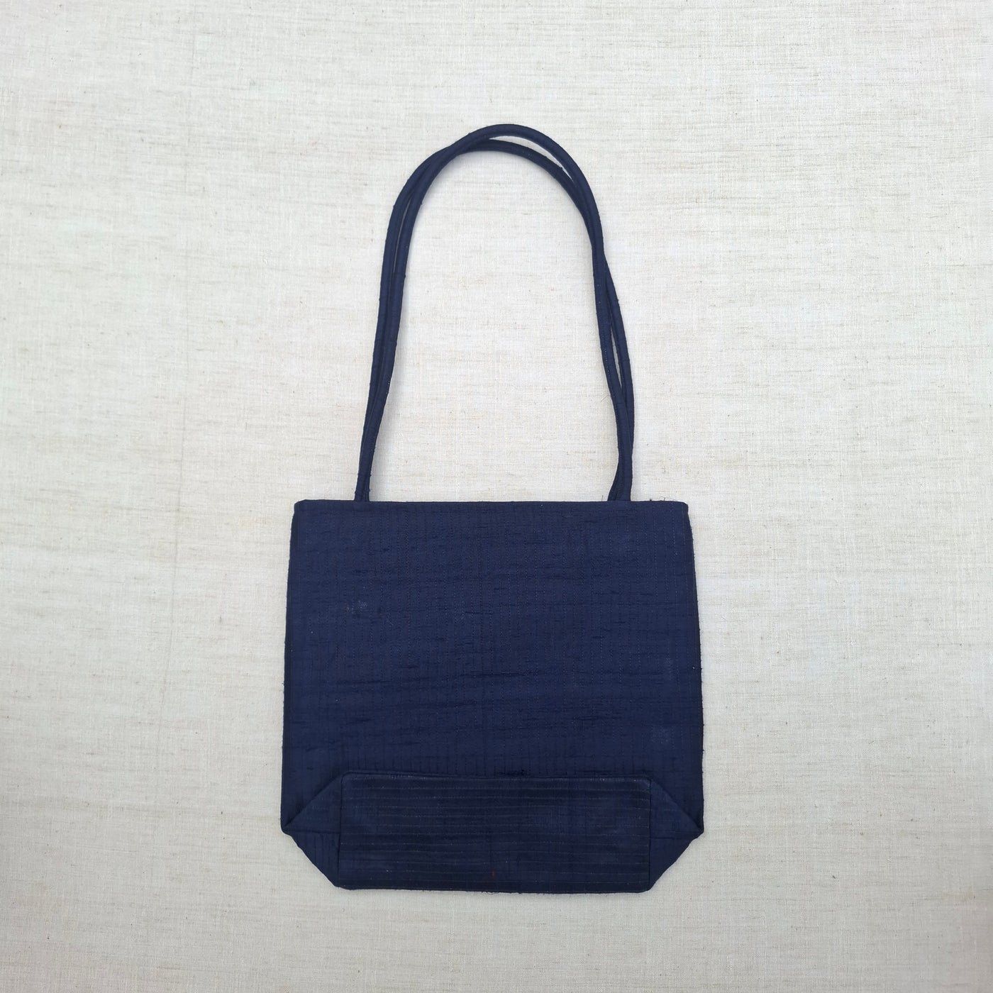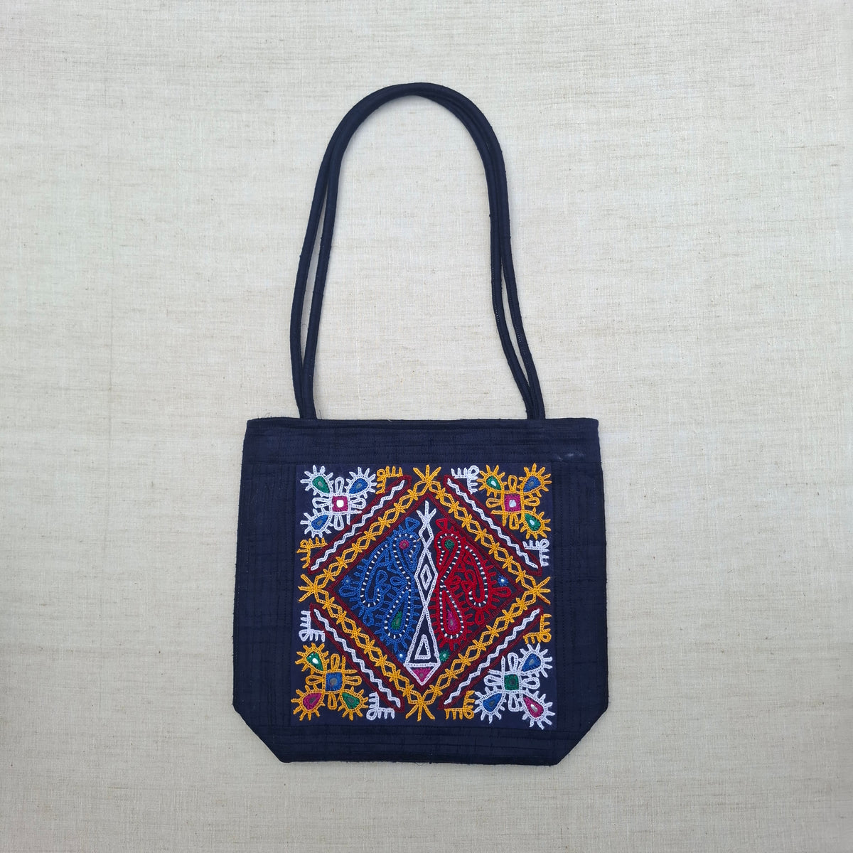 Made in dupion silk by Rabari artisans of Gujarat, the bag is designed for everyday use while carrying the presence of hand embroidery. It includes two inner zip pockets, a secure zip closure, and a sling strap for comfortable wear.