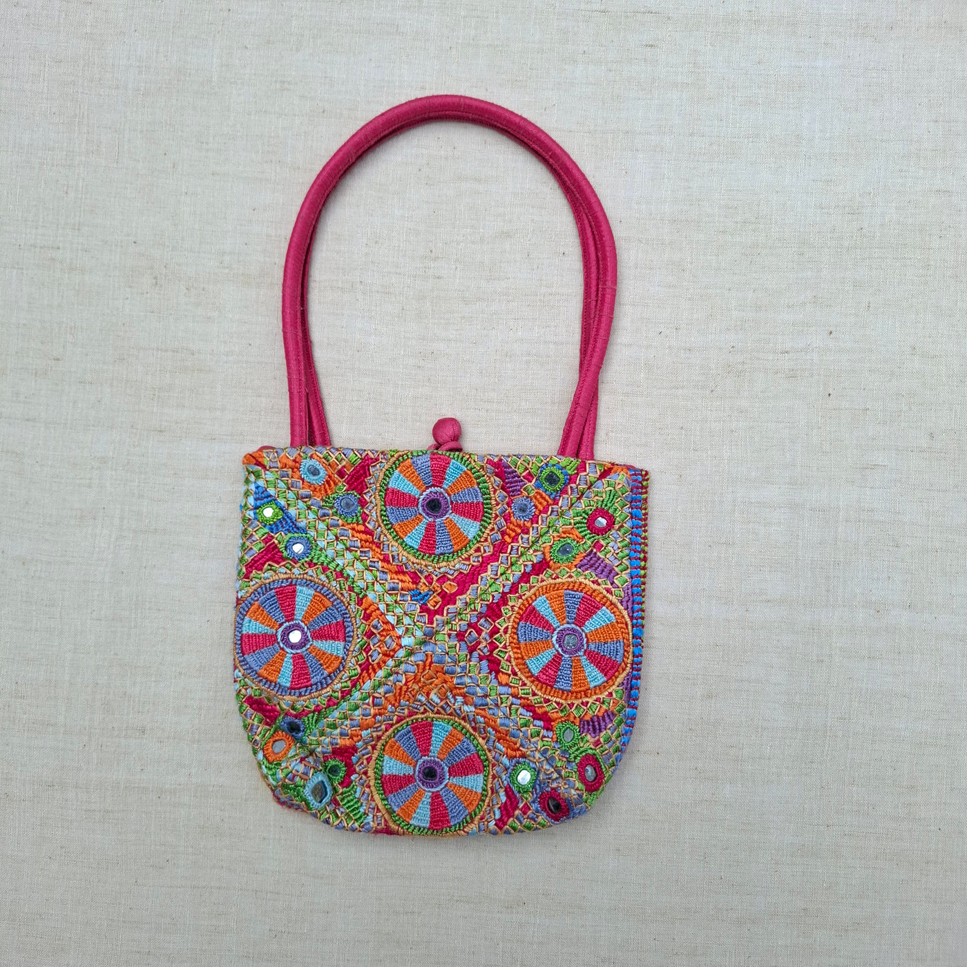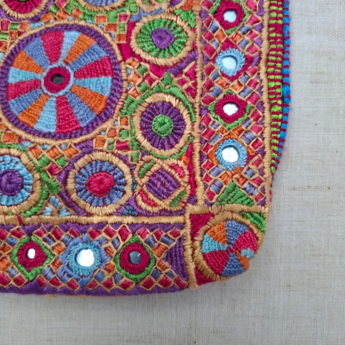 Jat dhaneta is practiced by the Jat fakiraani and dhanethah communities of the Kutch region of Gujarat. Only two stitches are used to create the geometric and abstract motifs that comprise this style: the open chain stitch builds the grid, and the satin stitch in radiating patterns fills in the grid. The combination of these two stitches rendered on thick, coarse , cotton-base fabric produces the denseness that is characteristic of this style. Craftswomen offset the denseness by using mirrors and rendering this style only on small surface areas. In doing so, they demonstrate that embroidery is not just about skill but also about an aesthetic sensibility and that they possess both in good measure.Measuring 7″ x 8″, it's a compact yet striking accessory. Dry clean only to preserve the intricate handiwork and vibrant colors.
